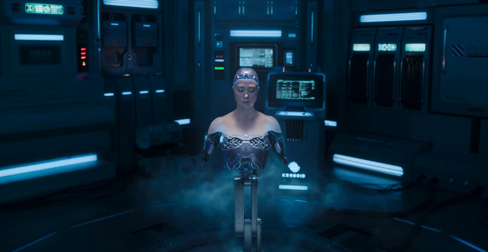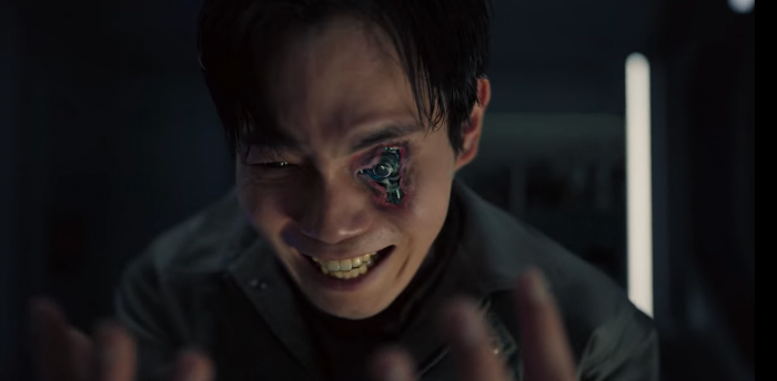 또 하나. 연구소장 상훈은 시도 때도 없이 꼰대 유머를 남발하는 잔인한 인물입니다. 크로노이드 회장이 자신의 뇌를 복제해 만든 로봇이기도 하죠. 그런데 이 인물의 성격을 꼭 이렇게 설정했어야 하나 싶습니다. 정이와 대립하는 비인간적인 인물로 보여주고자 하는 데에 굳이 영화의 흐름을 끊는 이런 유머들이 필요했을 싶은 것입니다. 아니면 대본을 좀 더 치밀하게 썼으면 영화의 흐름을 방해하지 않았을까 아쉽습니다. 배우끼리의 연기톤이 달라도 너무 다른 것 역시 한몫한 듯 합니다