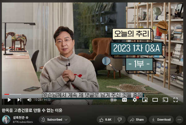 안녕하세요 레드카피입니다. 평소에 유튜브는 잘 보지 않는 편입니다. 몇몇개 구독한 채널만 가끔 봅니다. 그중 하나가 유현준 교수님의 '셜록현준' 채널이에요. 이미 책과 알쓸신잡 등 방송을 통해 유명해진 분이죠. 전 이 분에게서 느껴지는 진심이 좋습니다. 많은 사람들이 건축에 대해 알았으면 좋겠고 더 관심 가졌으면 좋겠다는 것이 느껴지거든요. 방송이나 셜록현준 채널에서도 대한민국 아파트나 상가들의 문제, 사람들이 잘 몰랐던 건축, 건물에 대한 것들을 친절하고 꼼꼼하게 짚어 주십니다. 그리고 가장 좋은 건 친절한 설명을 듣다 보면 제가 세상을 보는 관점이 점점 달라지고 있다는 것이지요. 흥미로운 주제들도 많이 다루고 계셔서 유튜브 즐겨 보시는 분들은 꼭 한 번 들렀으면 하는 채널입니다.