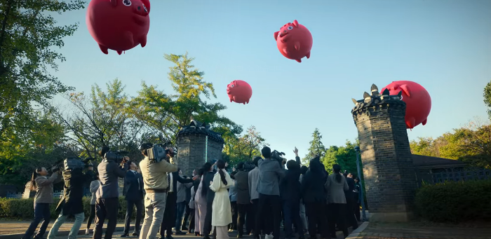 마지막에 종이의 집의 하이라이트 장면이 나옵니다. 돼지 저금통을 상징하는 돼지 풍선들이 평화 광장 하늘로 두둥실 떠오릅니다. 진짜 돼지 저금통입니다. 풍선이 터지면서 3억 불, 한화로 3천억이 넘는 돈이 나풀나풀 쏟아져 내립니다. 이 쇼는 보는, 겪는 사람들로 하여금 강도단의 목적이 돈이 아니었다라는 걸 강하게 인지시키는 쇼인 셈입니다. 동시에 강도단의 주장에 힘을 실어줍니다. 공권력과 재벌가가 연합해서 자신들의 배를 불리려 했다는 것 말입니다. 인질 협상 캠프에까지 쫓아와서 말도 안 되는 명령을 뿌리던 김상만은 시민들 앞에서 아니라고 변명하기 급급한 모습을 보이며 마무리가 됩니다. 이제 시민들은 강도단의 가면을 쓰고 촛불을 듭니다.